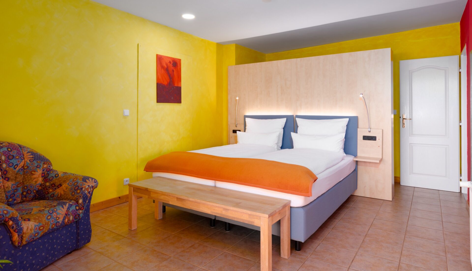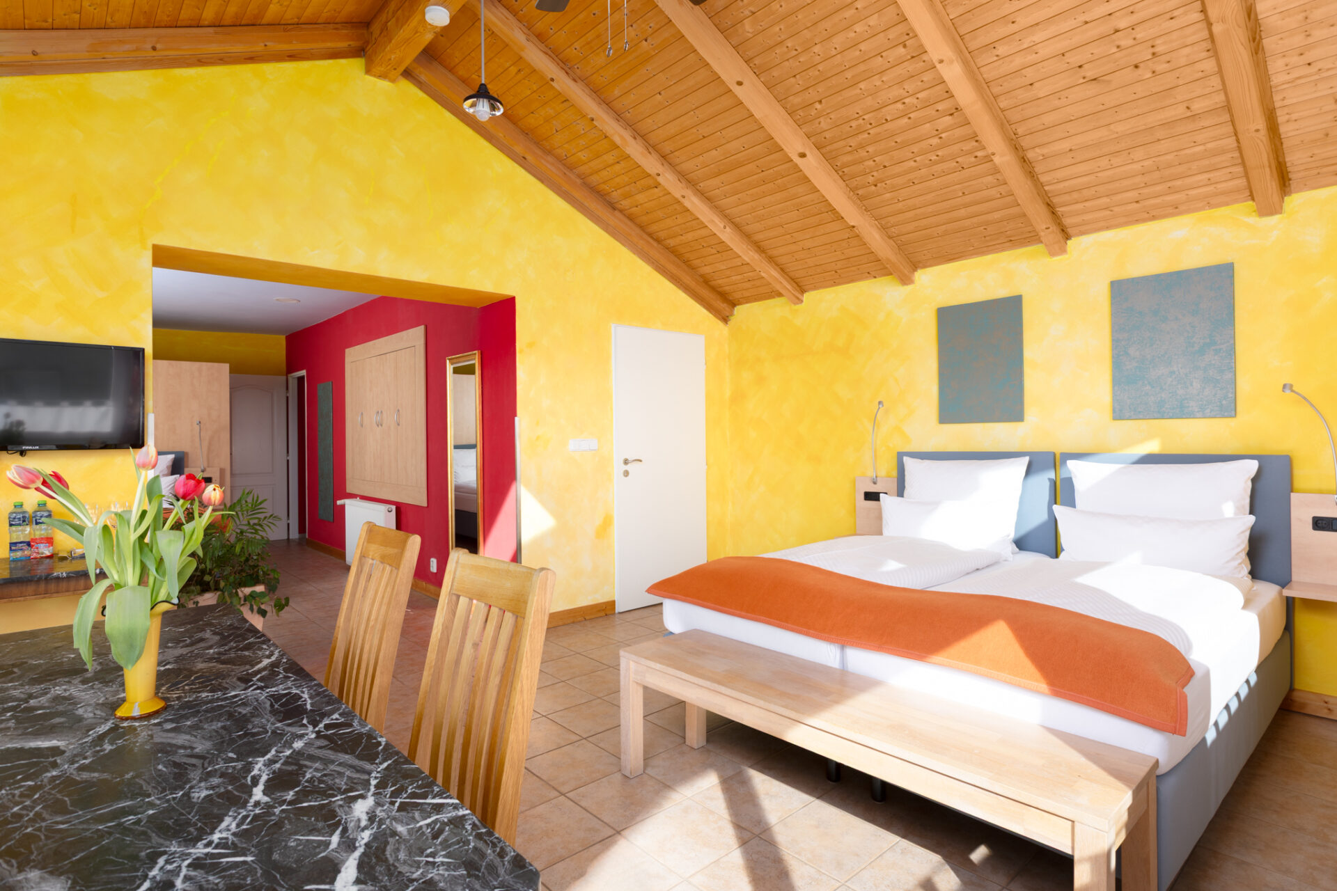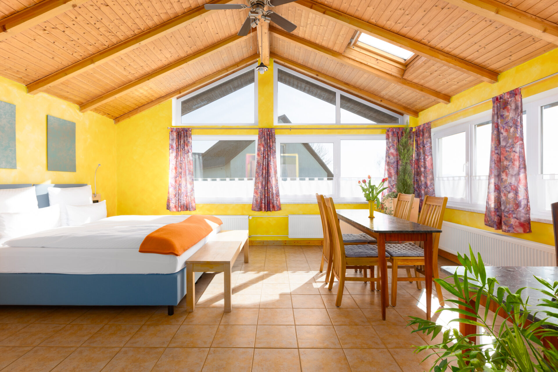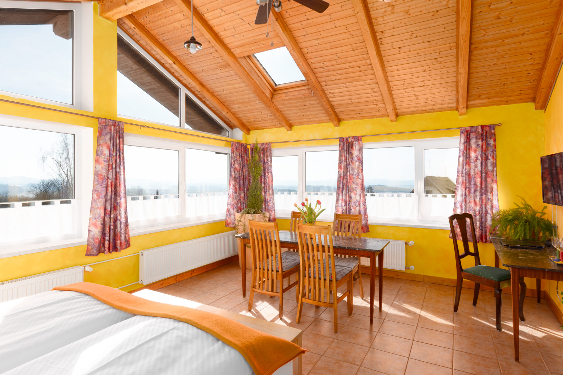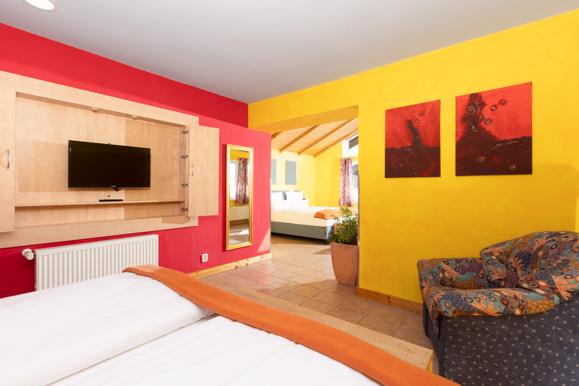 Enjoy you staying in our family room. It can accommodate up to 4 persons – with the option for an extra bed. Directly in front of the bathroom, there is the walk-in closet with a luggage rack. The room has a connecting door to the hallway of the single and double room. Through the panoramic window in the second half of the room, you have the most beautiful view of the surroundings. The ceiling fan increase your comfort. Two smart TV devices are available in the room.